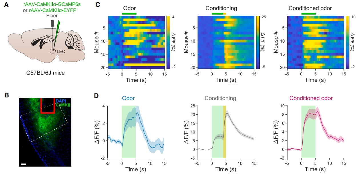2023年10月,徐州医科大学江苏省脑病生物信息学重点实验室李安安教授团队在Cell Reports 发表题为“Negative valence encoding in the lateral entorhinal cortex during aversive olfactory learning ” 的研究论文。本研究发现内嗅外侧皮质(LEC)参与嗅觉恐惧调节过程中负气味值的获得,而梨状后皮质(PPC)参与记忆-提取阶段。此外,对LEC CaMKIIa + 神经元的抑制会影响恐惧编码、恐惧记忆回忆和对有条件气味的PPC 反应。这些发现为LEC CaMKIIa+神经元参与负价编码提供了直接证据。